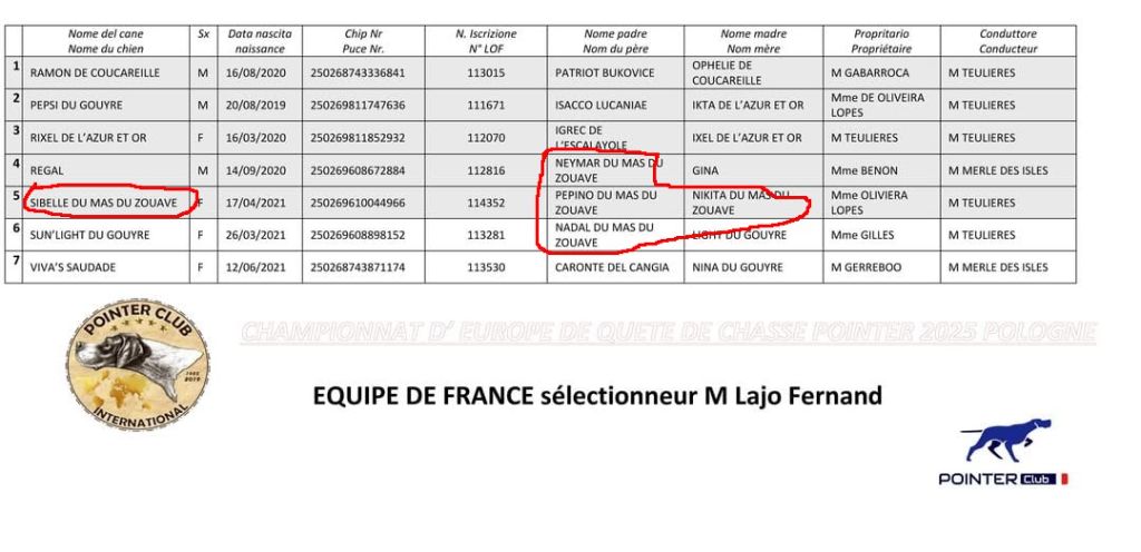 En Grande Quête, sur bécasses, sur bécassines, en montagne, sur perdreaux et faisans naturels ou en GT, il y a régulièrement un Mas du Zouave qui monte sur une marche des podiums et parfois sur les plus hautes de l'échelle européenne : Luna, Nina, Niet, Skipper, Sirène, Scarto, Sultane,Tafna, Tiflout, Uléna, Uno, Barça, Bambou, Bacchus, Be Bop, Banco, Buléria, Bagou, Cristal, Cupidon, Delmina, Ezael, Ethik, Esquisse... et d'autres arrivent encore.